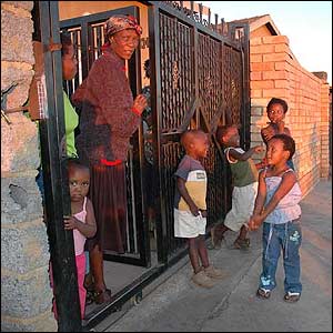 Street play Margaret Adams lives in Soweto's Zone Five, surrounded by the laughter of her grandchildren and their neighbourhood friends. Games include soccer with ragged balls, racing car tyres down the street and making toy vehicles by attaching round lids as wheels to plastic bottles. Here the streets are tarred and clean. |