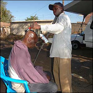 Street corner enterprise Entrepreneurial street barbers can been found at work on many of Soweto's street corners. They make up an odd collective of transient street businesses that include people cooking and selling meat, confectionary sellers and gambling tables. |