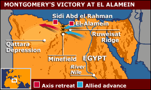 The longed-for breakthrough came after the start of the Battle of El Alamein on 23 October 1942. El Alamein is in Egypt, about 50 miles from Alexandria and on the east of the Mediterranean. It's a good place to have a swim and get refreshed from the sand and dust you had collected on whatever journey you were on. Most important, as El Alamein is by the sea, ships can unload and cargo can then go on to the trains.