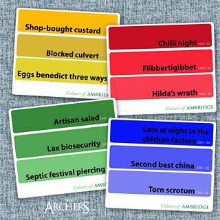 Splatter your kitchen with 'Shop bought custard', experience 'Torn scrotum' in your bathroom and fire up your boudoir with 'Chilli night'. It's the new Colours of Ambridge range - available only from the back of Fat Paul and Baggy's van.