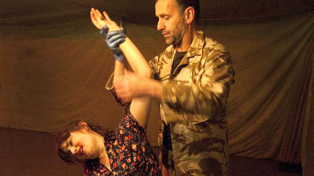 |Mae'n argoeli'n dda i'r gynulleidfa sydd yn aml o fewn llai na hyd braich i'r cymeriadau - gan gynnwys y milwr cydnerth, bygythiol sy'n dweud cymaint heb yngan gair gydol y ddrama. Yn fwriadol dyw'r actor sy'n chwarae'r rhan hon ddim yn cael ei enwi. Sgifi ydi o. Y dyn sy'n baeddu'i ddwylo i'r ddau arall gadw eu rhai hwy yn lân.