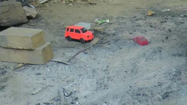 इन दो खिलौनों को वो कभी आगे खींच कर ले जाता तो कभी पीछे. उसके हाथों पर राख का रंग चढ़ गया था, लेकिन इस बात से अनजान वो चुपचाप राख पर अपनी खिलौना गाड़ियों को चलाने की कोशिश कर रहा था.