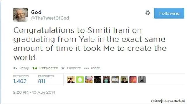 गॉड लिखते हैं ''स्मृति इरानी को बधाई हो. जितने दिन मुझे पूरी कायनात रचने में लगे थे उतने दिनों में उन्होंने येल यूनिवर्सिटी से डिग्री हासिल कर ली.''
