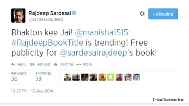 राजदीप ख़ुद इससे नाराज़ नहीं दिख रहे. उन्होंने कहा, ''जय हो भक्तों #राजदीपबुकटाइटल ट्रेंड कर रहा है <link type="page"><caption> राजदीप सरदेसाई</caption><url href="https://twitter.com/sardesairajdeep/status/498701192449372160" platform="highweb"/></link> के लिए मुफ़्त पब्लिसिटी.''