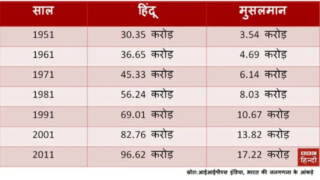 साल 2001 में हुई जनगणना के मुताबिक़ भारत की कुल आबादी 102 करोड़ थी. इसमें हिंदुओं की जनसंख्या 82.75 करोड़ (80.45 फ़ीसद ) और मुसलमानों की आबादी 13.8 करोड़ (13.4 फ़ीसद) थी.