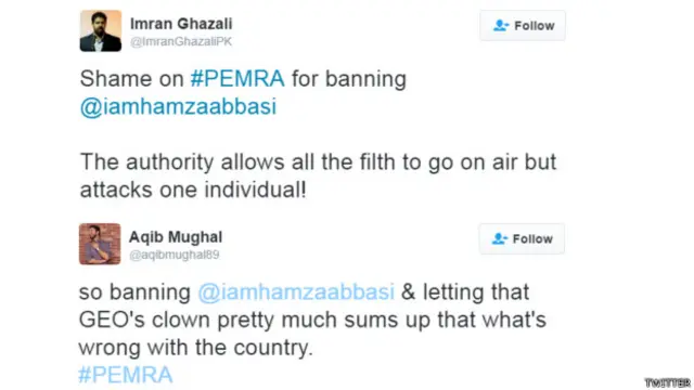 यूजर <link type="page"><caption> इमरान ग़ज़ाली</caption><url href="http://bit.ly/28Mggb6" platform="highweb"/></link> ने ट्विट किया, "@iamhamzaabbasi पर प्रतिबंध लगाने के लिए #PEMRA को शर्म आनी चाहिए. अथॉरिटी टीवी पर सभी तरह का कूड़ा दिखाने की इजाज़त देती है लेकिन एक व्यक्ति पर हमला करती है!"