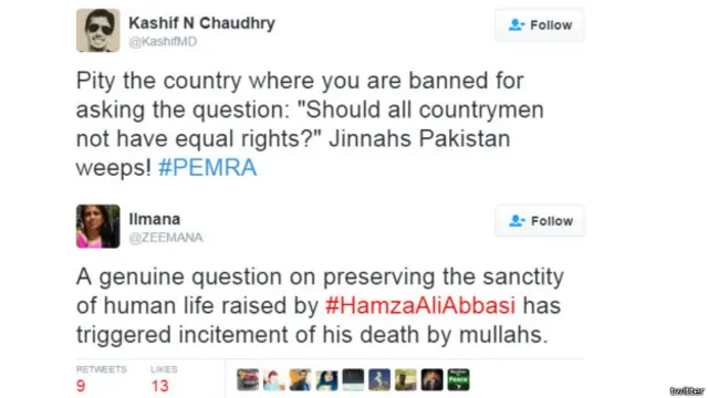 <link type="page"><caption> </caption><url href="http://bit.ly/1QcPmmQ" platform="highweb"/></link>इसी तरह, ट्विटर यूज़र <link type="page"><caption> इलमाना</caption><url href="http://bit.ly/1rud5D3" platform="highweb"/></link> ने ट्विट किया, "#HamzaAliAbbasi ने इंसानी जीवन की पवित्रता को बनाए रखने पर एक उचित सवाल उठाया और मुल्ला उनकी जान के प्यासे हो गए."