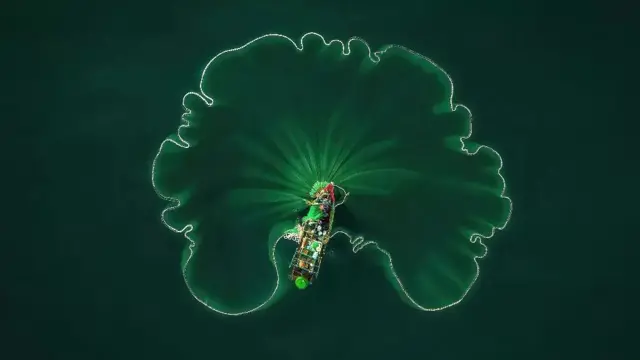 इमेज कैप्शन, 'लैंडस्केप ऑन वॉटर' कैटगरी में पहला पुरस्कार जीता वियतनाम के नूयेन वू की तस्वीर 'ओशियन लोटस लीव' ने. इस तस्वीर में कुआंग नेन प्रांत में संमदर में मछली पकड़ने वाले मछुआरों की चुनौतियों को दिखाया गया है.