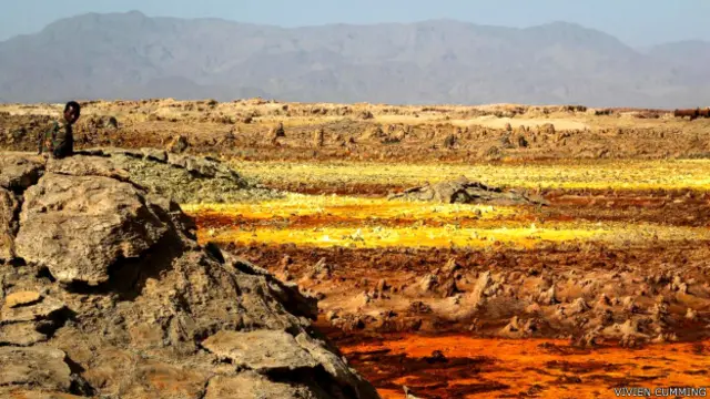जब 'डानाकिल डिप्रेशन' पहुंचेंगे तो आपक लगेगा कि आप धरती पर नहीं, किसी और ग्रह पर पहुंच गए हैं. यहां का मौसम बेहद गर्म और रूखा है. यहां वहां गड़्ढों में पिघलता लावा दिखएगा. आस-पास के इलाक़ों में लावे के ठंडे होने से बनी चट्टानें और पहाड़ियां दिखेंगी.
