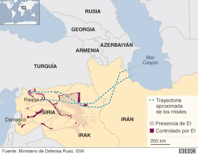 Rusia dijo haber atacado posiciones del grupo autodenominado Estado Islámico en Siria con misiles disparados desde barcos en el Mar Caspio, a unos 1.500 kilómetros de distancia.