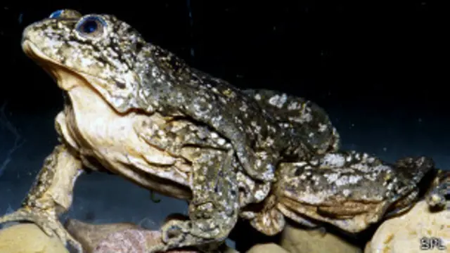 Também conhecida como "rã escroto", esse anfíbio vive somente no lago Titicaca, nos Andes. A rã desenvolveu uma capacidade pulmonar reduzida, então suas muitas dobras de pele a ajudam a respirar. De acordo com os relatos de alguns pesquisadores, estes animais fazem "flexões" no fundo do lago para criar perturbações na água e aumentar o fluxo de oxigênio.