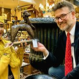 The competition is well and truly on as we battle it out in this best of five. Whoever wins the most auctions across the week will become the champion on this road trip. Charles means business as he opts for an ecclesiastical flavour with a pair of beautiful arts and crafts tabernacle panels and a collection of late-19th-century nun’s shoeboxes. He also scoops up a large decorative art deco vase, a George III chocolate pot and a Napoleonic ship’s log box. Jewellery lover Roo plumps for a Viking ring and a large papier-mache tray to name just a couple of her treasures.