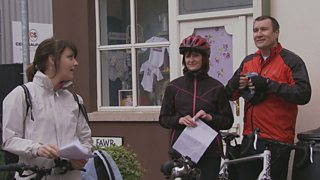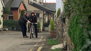 Mae Gaynor yn rhoi cynnig ar reidio beic. Gaynor has a go at riding a bike.