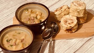 Parsnip chowder with rosemary, cheese and onion griddle scones