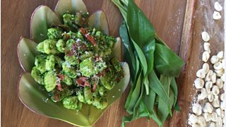 Handrolled oricchette pasta with wild garlic pesto and crispy bacon
