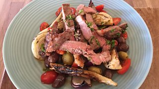 Grilled escalope of lamb with fennel, olives and tomatoes