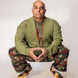 (Photo) Andrew 'Shovell' Lovell crouches, looking straight into the camera, fingers and thumbs steepled with the tips pointing downward. Andrew is mixed race, shaven headed and wearing multi-coloured camouflage trousers, a mid-green collarless jacket and trainers.