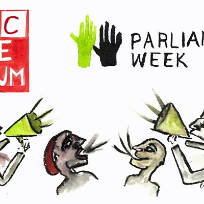 This week's Forum comes from the UK Parliament . Three distinguished guests and an audience probe the virtues and flaws of democracy in the Arab World and in Western parliamentary democracies. Illustration by Emily Kasriel