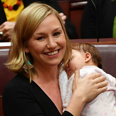 Australian Senator Larissa Waters has become the first politician to breastfeed in the nation's parliament. Ms Waters, from the left-wing Greens party, fed two-month-old daughter Alia Joy during a vote on Tuesday. She tells OS about her surprise following the international reaction and the responses of her colleagues and the Australian public. (Photo: Senator Larissa Waters soothes baby Alia Joy after breastfeeding her during a division in the Senate Chamber at Parliament House in Canberra, Australia, 09 May 2017. Credit: EPA/MICK TSIKAS AUSTRALIA AND NEW ZEALAND OUT)