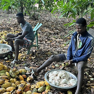 From the journey from cocoa to chocolate in Ivory Coast. The price of cocoa - the essential ingredient in chocolate - has more than quadrupled on the international market in the last two years. Yet many of those growing it have not benefitted. In fact, drought, disease and a lack of investment have led to catastrophic harvests and, therefore, a drop in income for many small producers of cocoa, especially in Ivory Coast. This West African country is the world’s largest producer of cocoa - up to 45% of the world’s total. Most of the growers are small-scale, poor farmers. There are now calls for these growers to get a bigger chunk of the chocolate bar and, in so doing, to help ensure future production. John Murphy travels to Ivory Coast to delve into the world of chocolate production. Presented and produced by John Murphy With additional production in Ivory Coast from Ebrin Brou Mixed by Andy Fell Production coordinator Gemma Ashman Series editor Penny Murphy (Image: Cutting open cocoa bean pods in Ivory Coast. Credit: John Murphy/BBC)