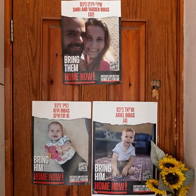 Commemorations took place in Israel this week to mark 7 October, 2023, when 1,200 people were killed by Hamas gunmen and 251 were taken hostage into neighbouring Gaza. Twelve months later, the bloodshed in the region has also spread to Gaza and Lebanon and Iran has been drawn into the conflict. As the fighting continues, for the families of the 97 hostages still in captivity, time has stood still. Eylon’s cousin, his cousin’s wife and their two young children were taken hostage and remain missing – something that was brought home to him during Iran’s recent missile attack on Israel. “The whole house shook like never before,” says Eylon, in Tel Aviv. “I just lay on the ground and prayed that I’m going to survive this. It was very, very scary. It made me realise that the way I felt for 40 minutes is how my family must be feeling for about a year". Eylon joins a conversation with Adam, in England, who is also hoping for news of his cousin. Both men say they are frustrated that the plight of the hostages can sometimes appear to be forgotten, especially on the global stage. Host Luke Jones also hears what life is like for three young Israelis in their 20s and the anxiety of daily rocket strikes, explosions and gunfire. One, a new mum, shares that she is too afraid to take her baby outside. A Boffin Media production in partnership with the BBC OS team. (Photo: Posters of the Bibas family, Yarden, Shiri, Ariel and Kfir who are being held hostage in Gaza, are displayed on a door at the home of the Bibas family in Kibbutz Nir Oz, southern Israel, September 30, 2024. Credit: Amir Cohen/Reuters)
