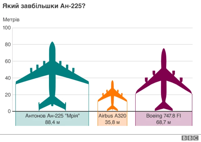 Ан-225 має шість двигунів і може перевозити вантаж до 250 тонн. Для порівняння, Boeing 747-800 здатний перевезти лише 140 тонн, а Airbus 330 - всього 65 тонн.