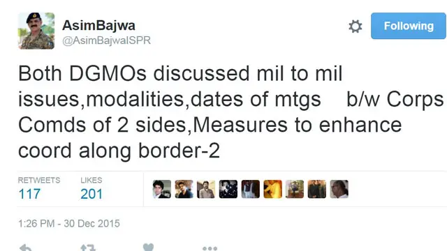 عاصم سلیم باجوہ نے ٹوئٹر پر جاری کردہ بیان میں کہا کہ بدھ کو اس سلسلے میں دونوں ممالک کے ڈی جی ایم او نے پہلی بار رابطہ کیا جس میں عسکری معاملات، دونوں جانب کے کور کمانڈروں کی مجوزہ ملاقاتوں کی تاریخ اور سرحد کے دونوں جانب تعاون کو مزید بڑھانے کے لیے اقدامات پر بات چیت کی گئی۔