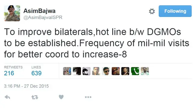 پاکستانی فوج کے شعبہ تعلقاتِ عامہ کے سربراہ لیفٹیننٹ جنرل عاصم سلیم باجوہ نے ایک ٹویٹ میں کہا ہے کہ پاکستان اور افغانستان کے ڈائریکٹر جنرل ملڑی آپریشنز (ڈی جی ایم اوز) کے درمیان ہاٹ لائن قائم کر دی گئی ہے۔