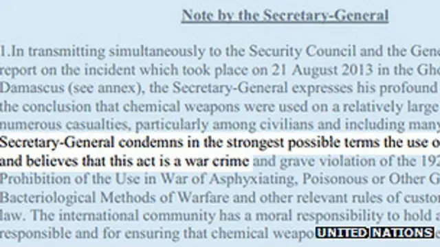 روسی وزیر خارجہ سرگئی لاوروف نے تصدیق کی کہ اتفاقِ رائے ہو چکا ہے مگر انہوں نے بتایا کہ اس میں اقوامِ متحدہ کے باب سات کے تحت براہ راست مداخلت کی دھمکی شامل نہیں ہے جس کے تحت فوجی کارروائی کی اجازت ہوتی ہے۔