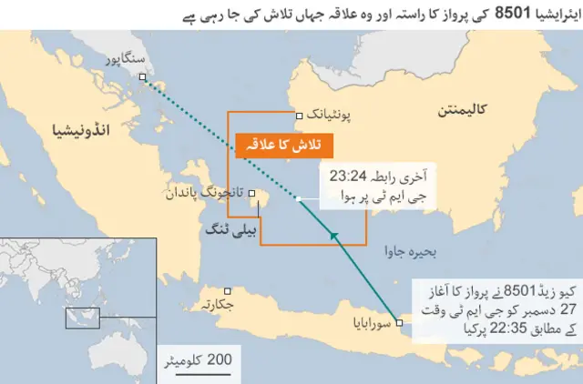 ملائیشیا کی نجی فضائی کمپنی ایئر ایشیا کی کیو زیڈ 8501 نامی یہ پرواز اتوار کی صبح انڈونیشیا سے سنگاپور جاتے ہوئے دورانِ پرواز لاپتہ ہو گئی تھی۔